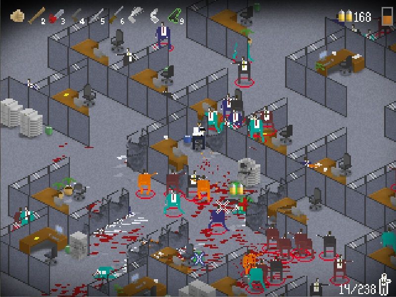 Canadian programmer and musician bignic takes a literal interpretation of the office zombie metaphor in his pixilated, isometric shooter/beat 'em up Zombies. The story is rather simple: amidst the shuffling of papers and painfully dull presentations, employees begin to inexplicably transform into bloodthirsty zombies. You play as a blunt and hilarious employee known only as “Dude,” who watches as his cubicle mate, Norm, has his face eaten by one of the recently turned managers. After this display of gnarly violence, Dude wisely decides it’s in his best interest to escape from the office. What follows is twenty five levels of bludgeoning, shooting, and smashing as our protagonist attempts to navigate the maze of his employment to find an exit. Along the way, he’ll run into characters who reluctantly give him support and be forced to fight zombified superiors for survival.