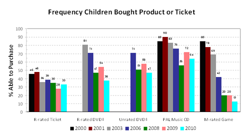 Sales of M-rated games to minors have decreased drastically over the years and are now less frequent than any other restricted sale (image from FTC)