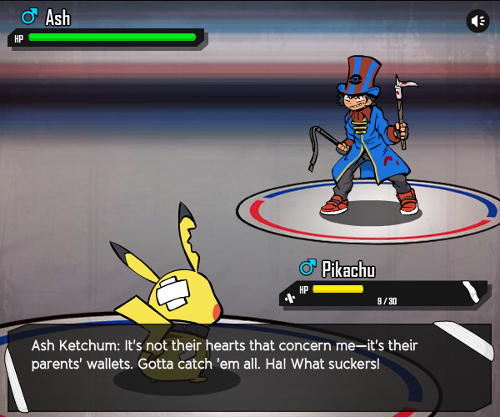 The game-world in Pokemon Black and Blue is so bloody and grotesque that it's comical. Each pokemon are shown with bandages and scars on their body as a way to show off how abused they are. All the trainers are presented with a crazy-face, with no awareness of the Pokemon's feelings. Characters like Ash Kechum and Professor Juniper are polar opposites of their official personifications, wanting to abuse animals just so they can abuse animals like a cheap, Saturday morning cartoon villain. Pokemon is about fighting, but also caring and fighting against Team whatever for the rights of Pokemon. PETA's game is a world of poachers and unsympathetic humans that escaped from an insane asylum.