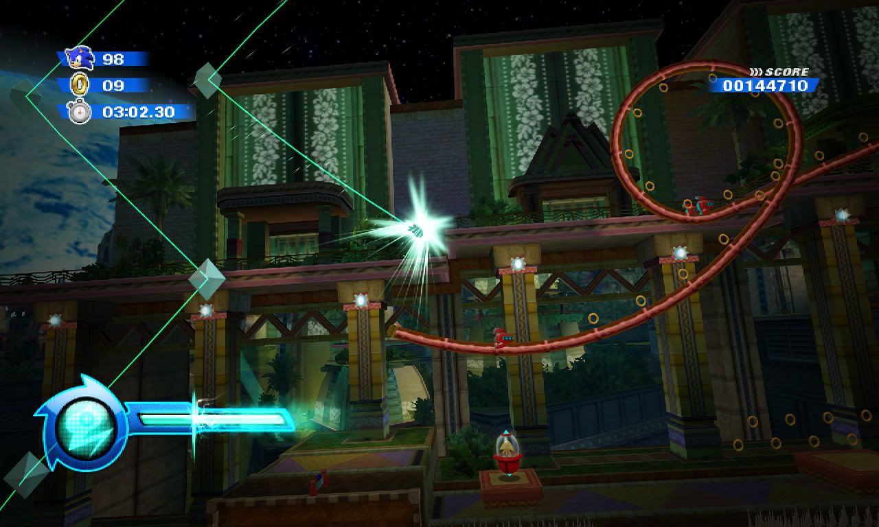 This screenshot, however, is about pure speed. Now that he's past those diamonds, Sonic will land on the rail and grind through the loop without stopping. At this point all the player has to do is hold right on the directional pad and Sonic will get through this part easily.