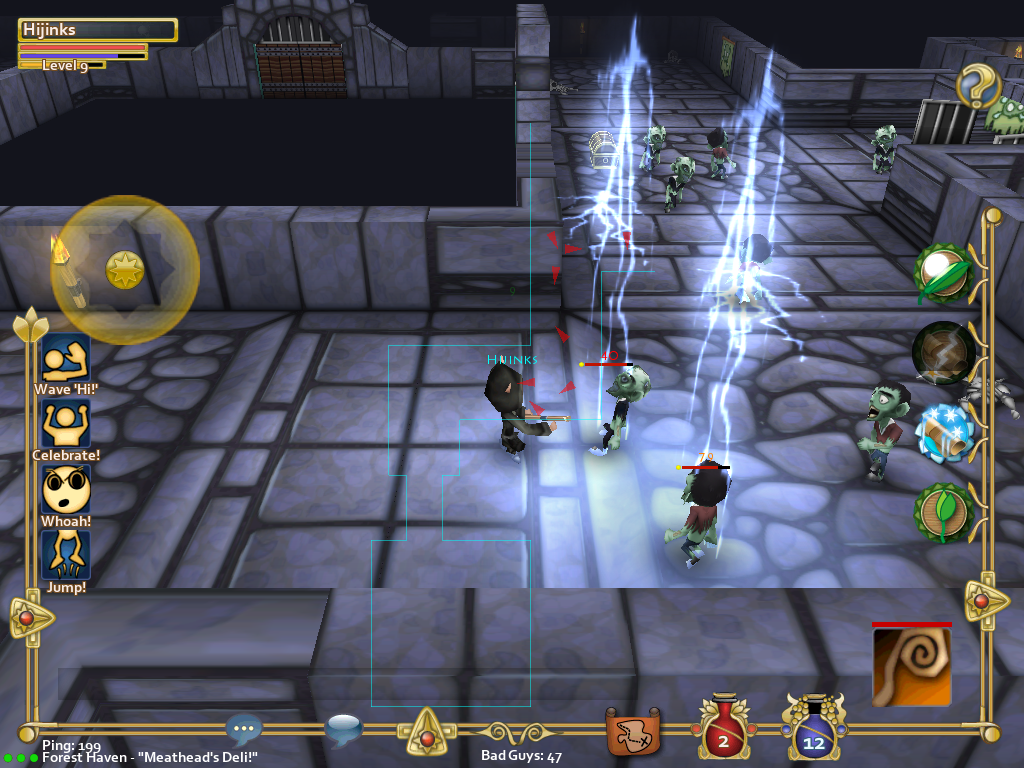 My fellow iPad gaming buddy and I spent quite a bit of time in the game this week, and our first impressions weren't that great. The game was laggy, repetitive, and frustrating to play with our quickly depleted potion supply and insta-deaths due to the lag. After a while we moved from the coffee shop Wi-Fi/3G to the home network, and the experience got a lot better. Less lag meant fewer deaths, and our Archer/Enchantress combo easily kited the bad guys all over the map. Incidentally, shooting arrows out of your back? Awesome level 1 ability. World of Warcraft should take notes.