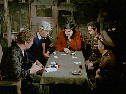When MASH surgeons need to do something with their hands, they play cards. It's cool, it's tense, and it adds some action to dialogue scenes. Gambling is full of bold-sounding terms like "no limits" and "aces high," and it's inherently more exciting than drinking or smoking (two activities which directors rely on for visual seasoning).