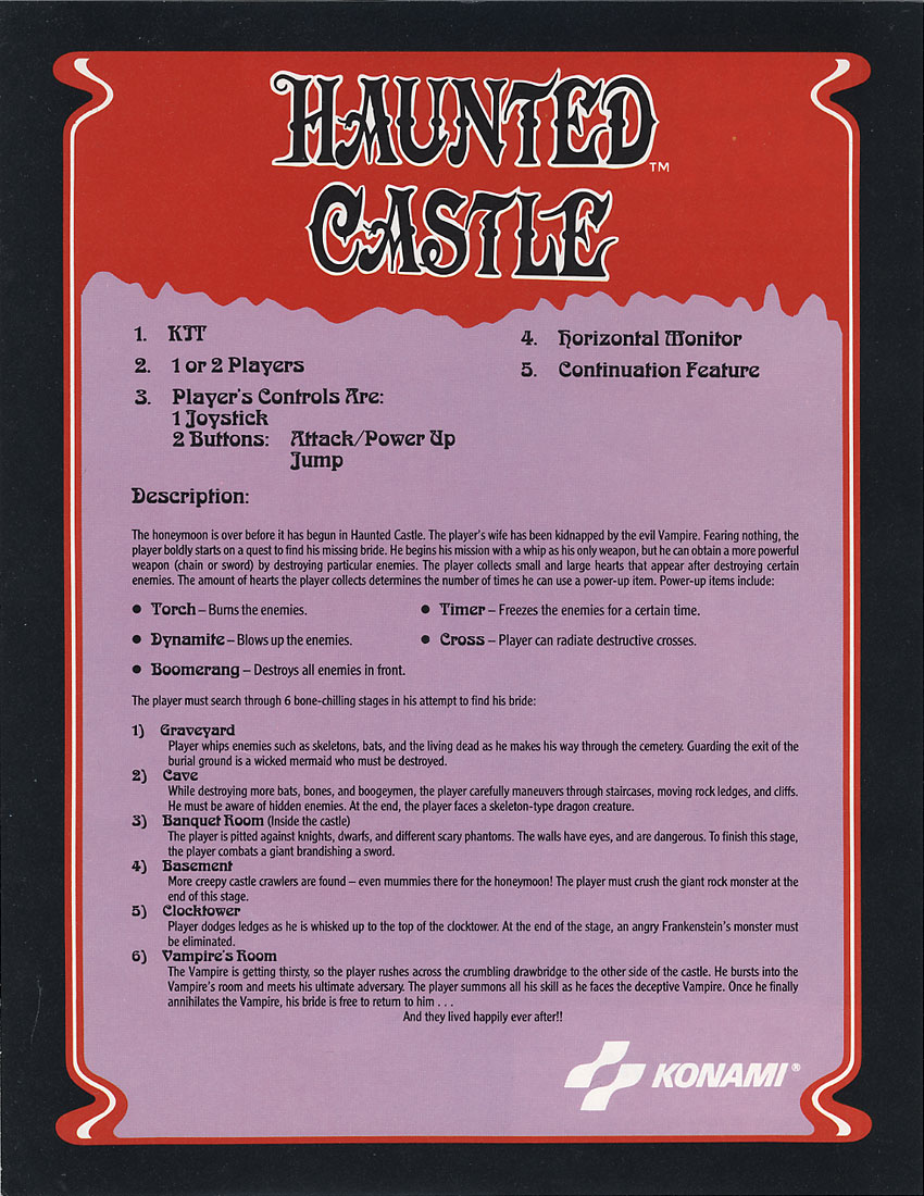 Known as Haunted Castle in the U.S., this clunky remake of the first Castlevania game is poorly realized and frustratingly difficult to control. This wasn't just a Nintendo Entertainment System hooked up inside an arcade cabinet, either. Konami completely redesigned it.