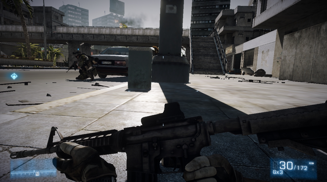 This is Battlefield 3’s saving grace. So while its singleplayer is nigh-comically implemented, with its ridiculous “RETURN TO THE COMBAT ZONE” notifications and clumsy, perfunctory quick-time events, and begrudgingly gigantic exploding set pieces, it still plays like Battlefield. And despite the inclusion of a multiplayer map set in a completely closed kill corridor, it still plays like Battlefield. And despite rehashing and actually reducing the amount of destructibility in each of these situations, it still does something new, and something better.