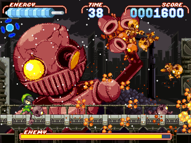 So I open up steam to purchase the Toy Soldiers port from the Xbox 360 as I loved that game on console. I'm about to open up the store page when something catches my gaze. A seemingly archaic front cover of some strange game called "Noitu Love 2 Devolution". It really does look like a throwback to older title screens I'd seen before and my curiosity got the better of me. I find myself in a strange land filled with a side scrolling green ninja fighting a giant, bald, red robot dropping little orange buggers everywhere on the screen. A familiar score meter on the top right, a time limit in the middle and a striped energy bar on the left hand side. And of course, the boss health bar that takes up the bottom of the screen filled with yellow.