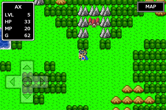 One last original game I decided to try out is Guardian Saga, which is basically a clone of the original Dragon Quest right down to the battles depicted in first person and some of the sound effects. The only big difference is that you can save anywhere. Everything about it works surprisingly well, especially because it’s on my phone. I started to get the sense of how real this game is when I first looked at the world map, which looks comparable to that of any old-school Final Fantasy game. The game world even feels decently developed, too, so it’s not like this is some throwaway clone.