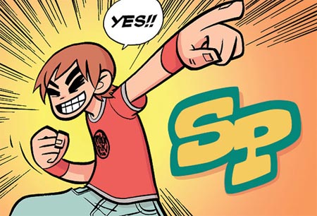 Scott Pilgrim VS the World is a new milemarker in film making. From what I'm aware of, no other movie asside from cartoons has displayed the comic's genre better then this film. Different shots and scenes literally spell out onomonopias like you would see them in graphic novels. During some fight scenes as well as a scene taking place on the phone with Scott, his sister, and Scott's roommate, there is a space between two or even three "panels" that normally serve as the essence of graphic novels.