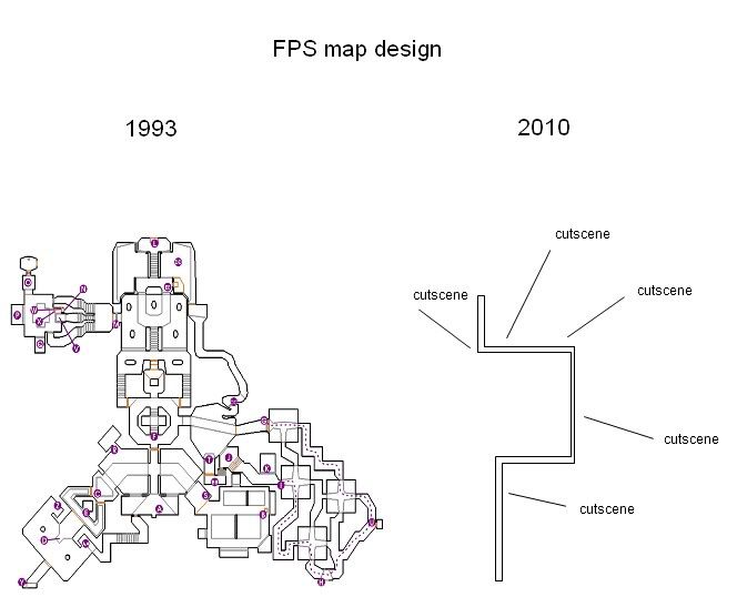 Whether they're disguised by furniture clutter or parallel corridors, let's face it: Black Ops typifies the kind of FPS design that is becoming something of an epidemic in this generation. Gone are the wide open spaces of yesteryear. Though counter-arguments will say that it's to support the narrative, playing through many of its levels, scripted door kick downs, clown car spawns, and locked doors still feels a lot like being funneled to the inevitable cut scene. Kind of like this: