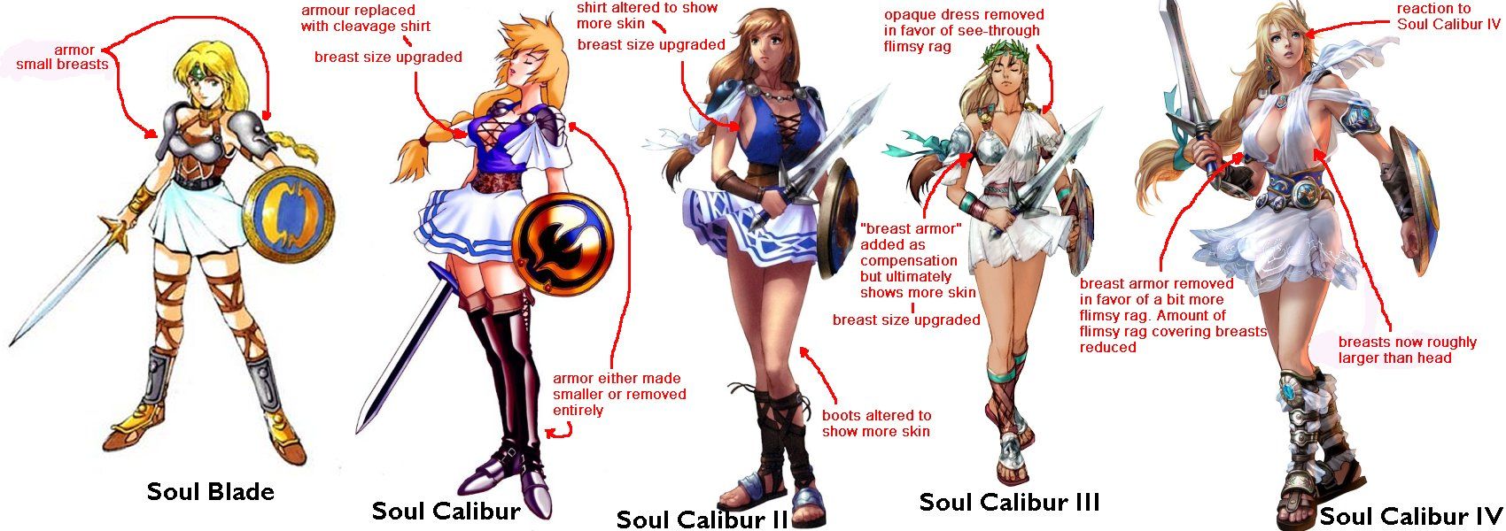 But periodically, something happens that reminds me that I should probably care more. Two years ago, I was playing Soul Caliber 4 in the living room of the apartment I shared with three other women. One of my roommates sat down next to me and watched for awhile. This wasn’t unusual. My roommates viewed my hobby as a lovable quirk. Eventually, I glanced her way and saw a disgusted look on her face. I was fighting against Ivy, she of the notoriously large breasts and buns. I hadn’t considered how the character must look to someone unfamiliar with the design tropes of video games. I actually felt my face start to burn.