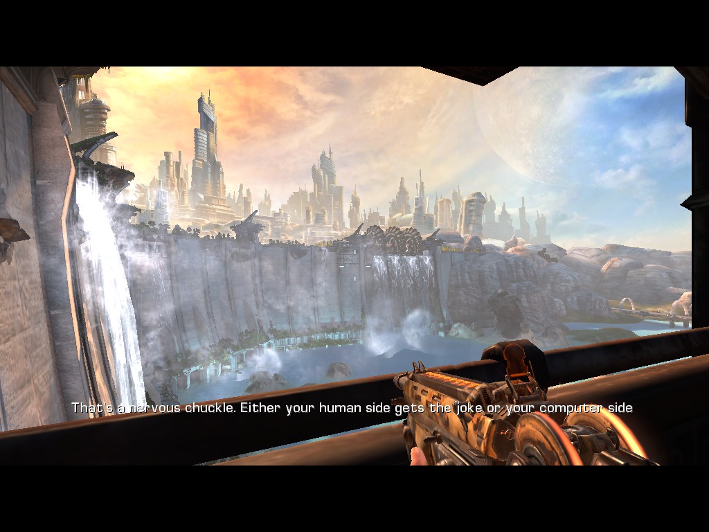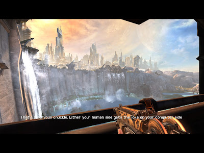 Bulletstorm is a finely tuned laser beam of incalculably large radius composed of all the purified elements of modern first person shooters. Thus, the act of playing bulletstorm is an exercise in the delicate guidance of said laser beam upon various metaphysical objects of one's perception. When aimed externally, it is a parody: it tears apart the serious, stern-faced gazes of our military sims to reveal their undeniable, crude, and ultimately ridiculous game mechanics beneath. It reveals to us the reality of he medium and proclaims an inescapable inevitability for any and all games that have proclaimed or may yet proclaim any kind of closeness to reality. It makes us feel good. It makes us feel enlightened. It makes us feel vindicated. It also makes us realize how empty games are.
