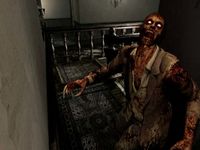 But when you turn around and take two steps, the zombie is now standing, is pissed off, and is the color of a soiled Chicago Bulls jersey. No sweat, let me just equip a shotg . . . . OH MY GOD HE'S RUNNING LIKE EIGHT TIMES FASTER THAN ANY OTHER ZOMBIE!!!!! Phew I'm behind a door . . . CRACK! Zombie flings open the door and proceeds to snack on you like a $2.00 Denny's special.